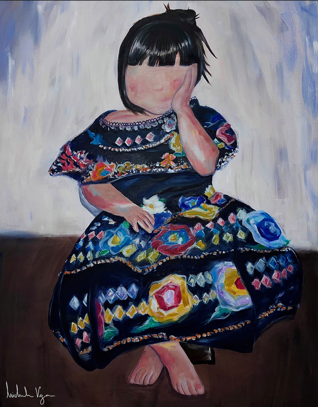 As a second-generation Latina, I’ve often wrestled with the concept of 'otherness,' this painting reflects that internal conflict. Despite the challenges, my culture has instilled in me the values of strength, pride, family, and tradition, of which I am most proud. ‘Mexican Daughter’ is a snapshot of my childhood, capturing a moment of innocence and cultural richness that will remain with me forever. It is both a personal testament and a celebration of the culture that shaped who I am today.”